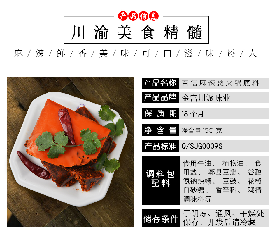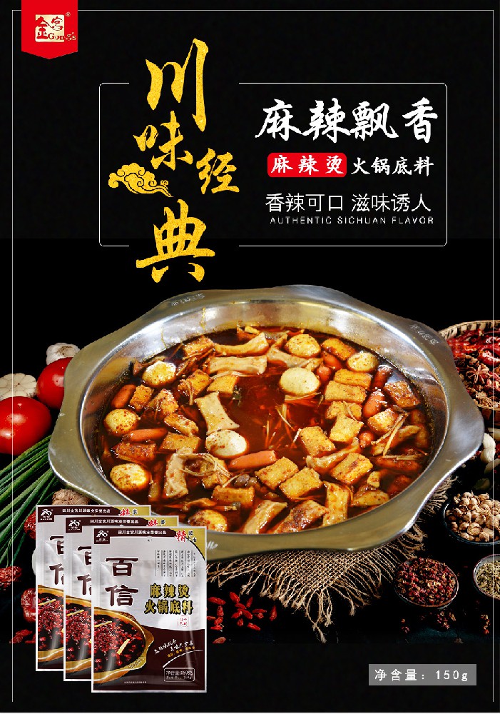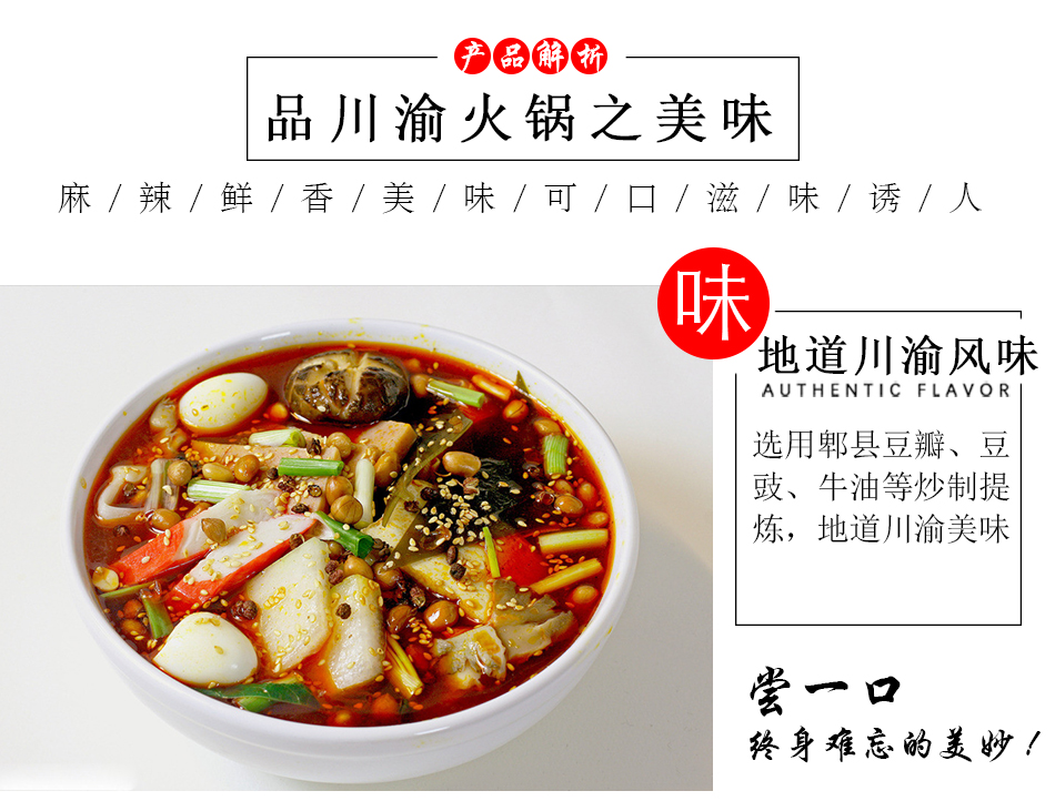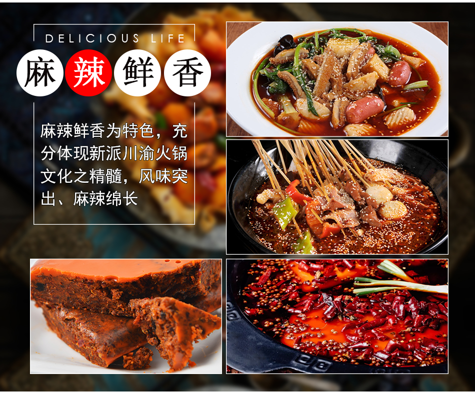 產(chǎn)品簡(jiǎn)介:本品采用天然香料,經(jīng)火鍋配料師反復(fù)研究,結(jié)合現(xiàn)代工藝精制而成。本品以麻、辣、鮮、香為特色,充分體現(xiàn)了新派川渝火鍋文化之精髓。它風(fēng)味突出,麻辣綿長(zhǎng),是餐館、家庭制作火鍋的理想底料。