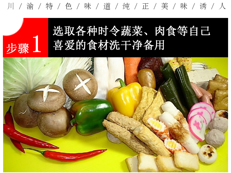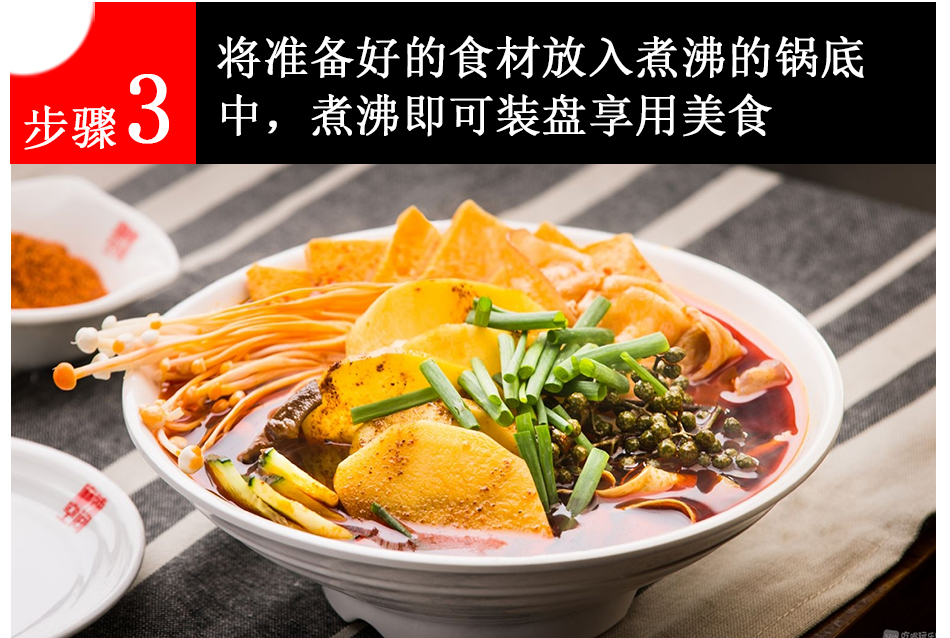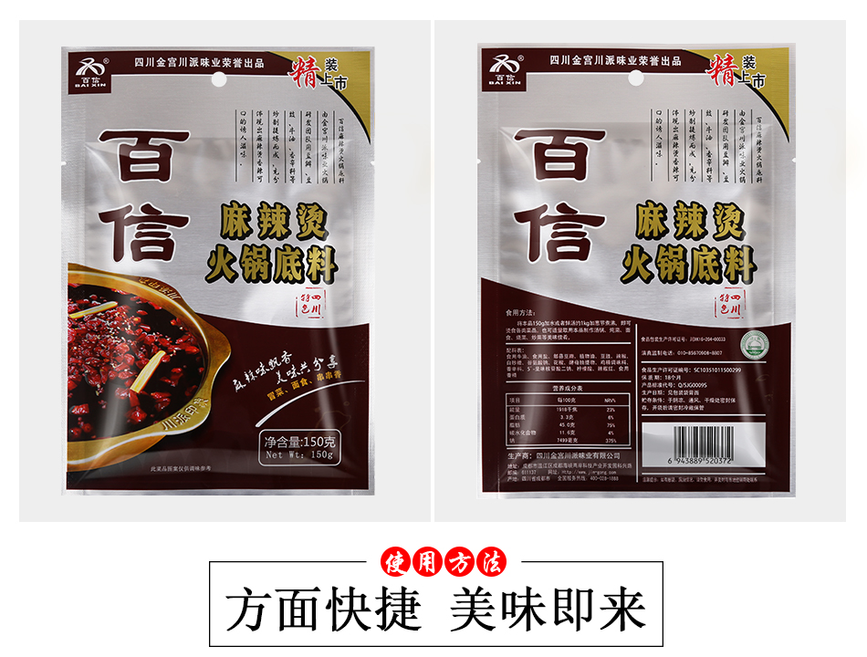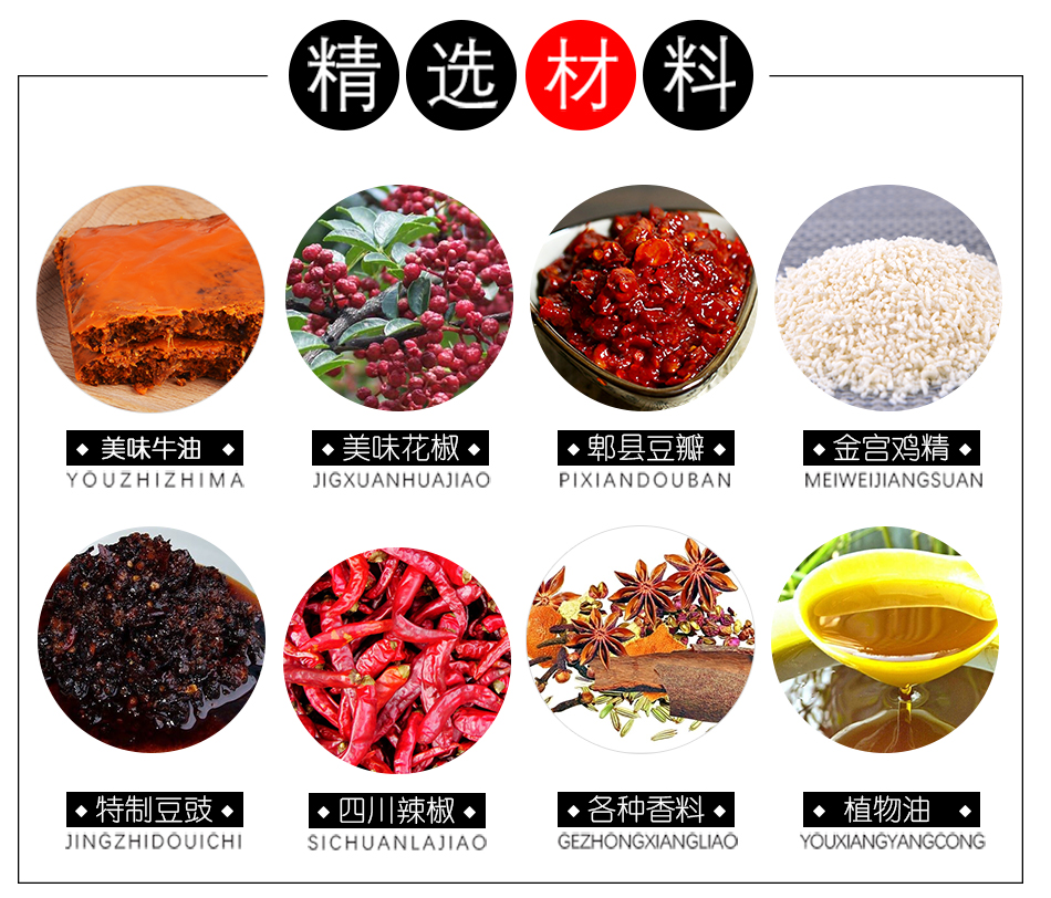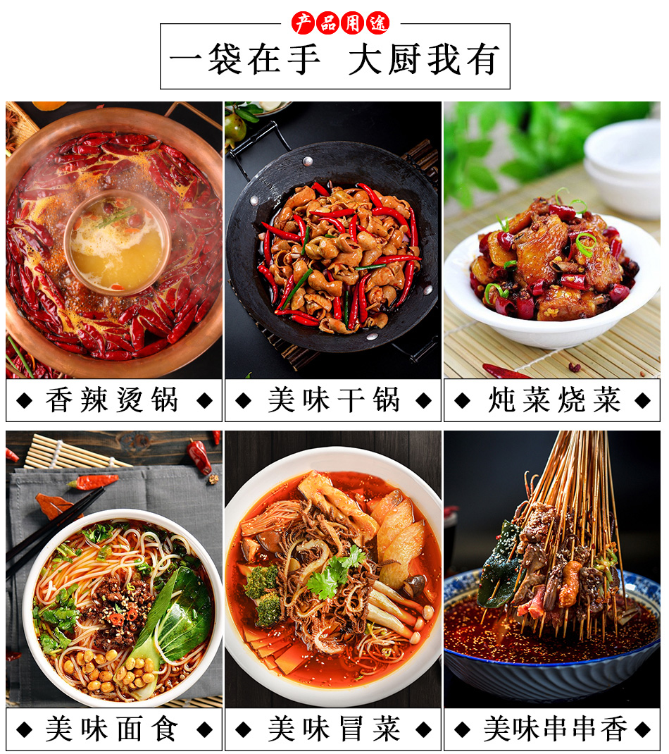 產(chǎn)品簡(jiǎn)介:本品采用天然香料,經(jīng)火鍋配料師反復(fù)研究,結(jié)合現(xiàn)代工藝精制而成。本品以麻、辣、鮮、香為特色,充分體現(xiàn)了新派川渝火鍋文化之精髓。它風(fēng)味突出,麻辣綿長(zhǎng),是餐館、家庭制作火鍋的理想底料。